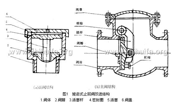在原旋啟式止回閥閥瓣上增設緩閉副閥(圖1)。副閥安裝在主閥閥瓣下側或兩側且用螺紋聯接,介質正常流動閥門開啟時,介質壓力將副 閥打開,介質通過副閥小孔流入主閥出口端,使主閥進水口端卸壓,主閥閥瓣開啟,主閥前后壓力趨于平衡;介質逆流時,主閥閥瓣在逆流介質作用下快速關閉,而副閥閥體上部為緩沖缸,副閥閥蓋旋入閥體上部其蓋上有一小孔,副閥閥瓣與其活塞桿空套有一定間隙,活塞與緩沖缸之間采用O型橡膠圈密封,活塞下部與閥瓣之間為平面密封;當副閥閥瓣隨主閥閥瓣關閉而關閉時,因副閥閥蓋小孔的作用,介質通過小孔逐漸流入副閥緩沖缸上腔體,一部分介質通過副閥閥瓣與活塞桿之間的間隙倒流,故副閥活塞是緩慢關閉的。該結構主閥的關閉相當于快關階段,副閥的 緩慢關閉相當于慢關階段,依據泵站機組水力和機械過渡機理說明該結構設計能有 效地防止水錘升壓。