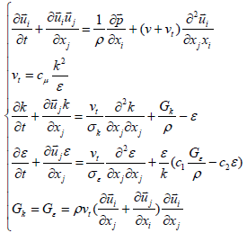 式中:ρ為密度;為壓力;k為湍流動能;ε為湍流動能耗散率;為速度矢量;xi和xj為坐標參數;v為湍流粘度;vt為湍流粘性系數;Gk和Gε為由平均速度梯度引起的湍流動能及湍流動能耗散率的產生項;cμ、σε、σk、c1、c2為常數,在標準k-ε模型中,cμ=0.09,σε=1.3,σk=1.0。