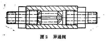 在氣缸下部進(jìn)出口處安裝一只降噪異通閥,此閥進(jìn)氣時(shí)由于阻尼作用,能夠控制啟動(dòng)氣流量,排氣時(shí)則自動(dòng)轉(zhuǎn)換成正常通路。同時(shí),活塞下部氣缸間的空間容積盡可能變 小。在這二個(gè)條件同時(shí)具備情況下,當(dāng)楔式閘板受活塞和閥桿推力開動(dòng)》活塞快速移動(dòng)一小距離時(shí),其下部空間壓力隨即變小,甚至產(chǎn)生瞬時(shí)負(fù)壓。從而可減小或避免氣流沖九達(dá)到降噪目的。見圖1。為了降低開閥噪聲我所自制了一只降噪異通閥(見圖2),用于氣動(dòng)閘閥壽命試驗(yàn)氣路上,試驗(yàn)中對(duì)閥門啟動(dòng)有較好的減噪作用。由于當(dāng)時(shí)受試驗(yàn)用閥門的氣動(dòng)構(gòu)件設(shè)計(jì)制造情況所限,其實(shí)際空間容積 VG較大,上述二個(gè)條件中小的條件不滿足,因而降噪程度還未能達(dá)到要求。筆者認(rèn)為,如果進(jìn)一步降低VG,則降噪效果將會(huì)提高。